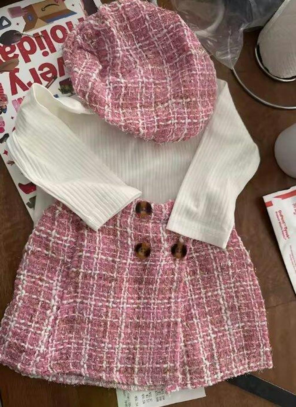 This Mimou set includes a knitted long-sleeve top, plaid skirt, and matching hat.